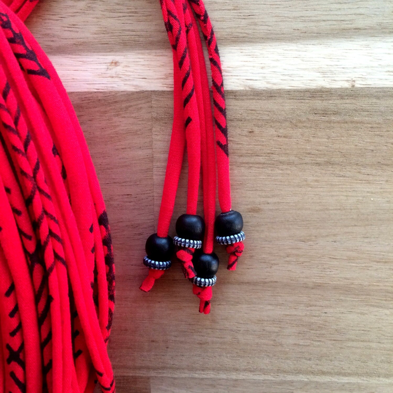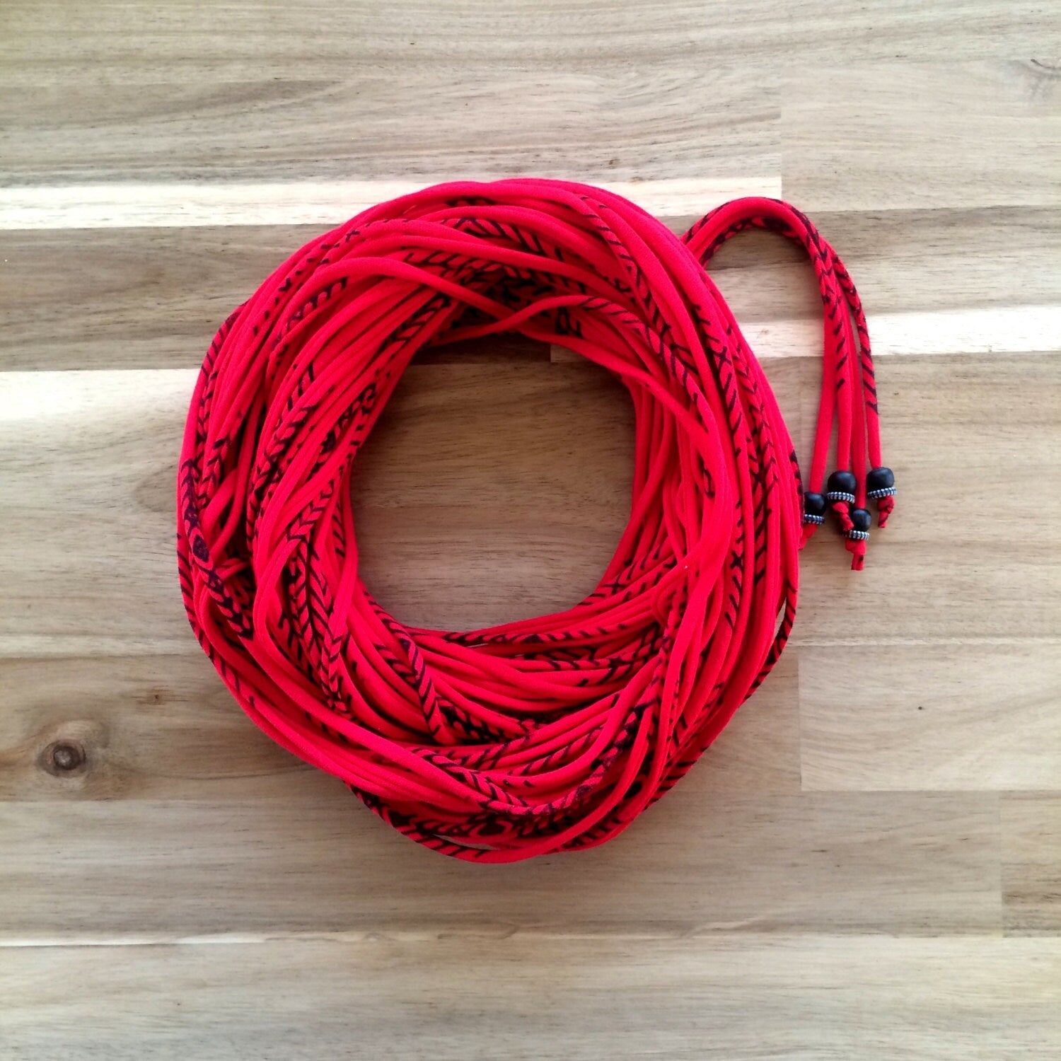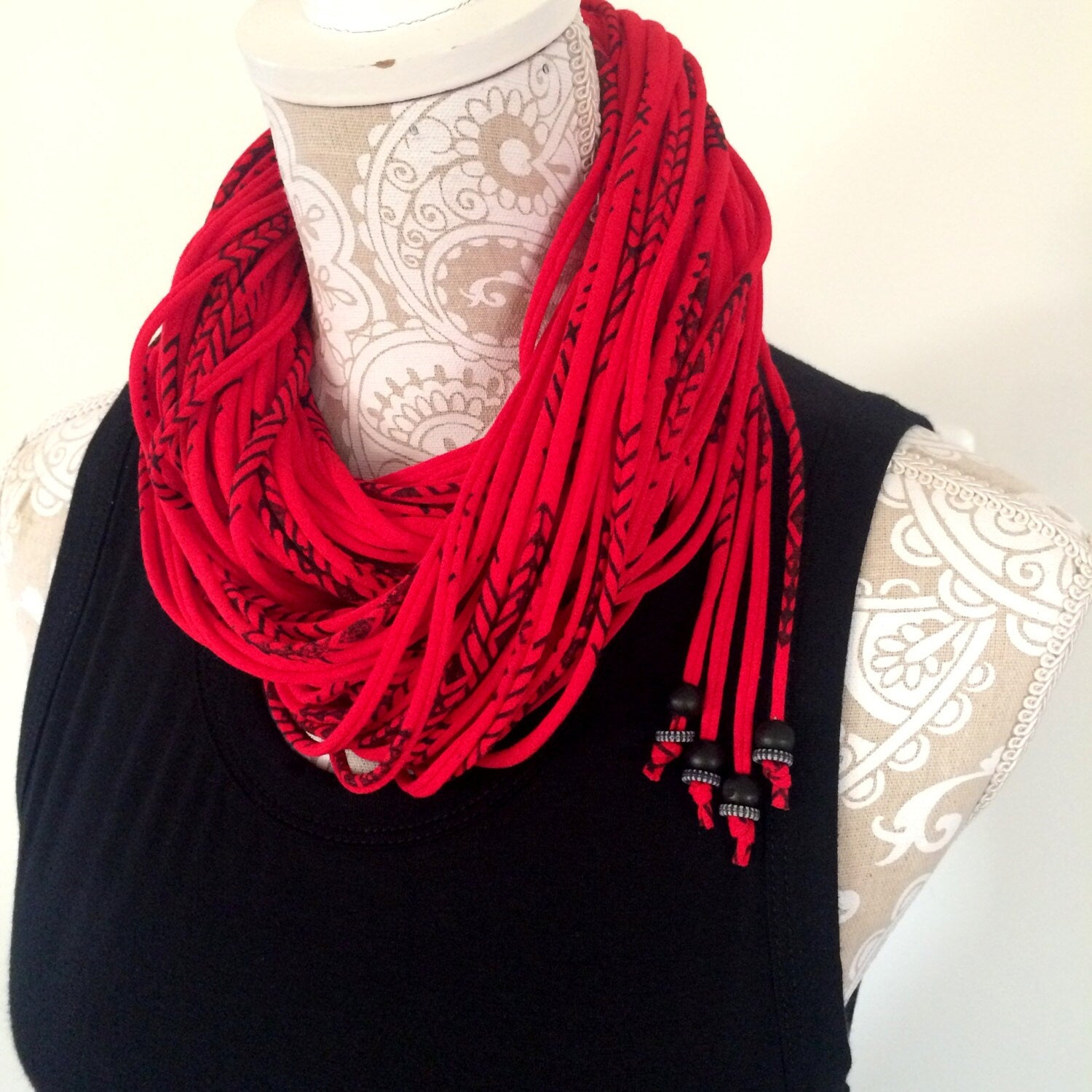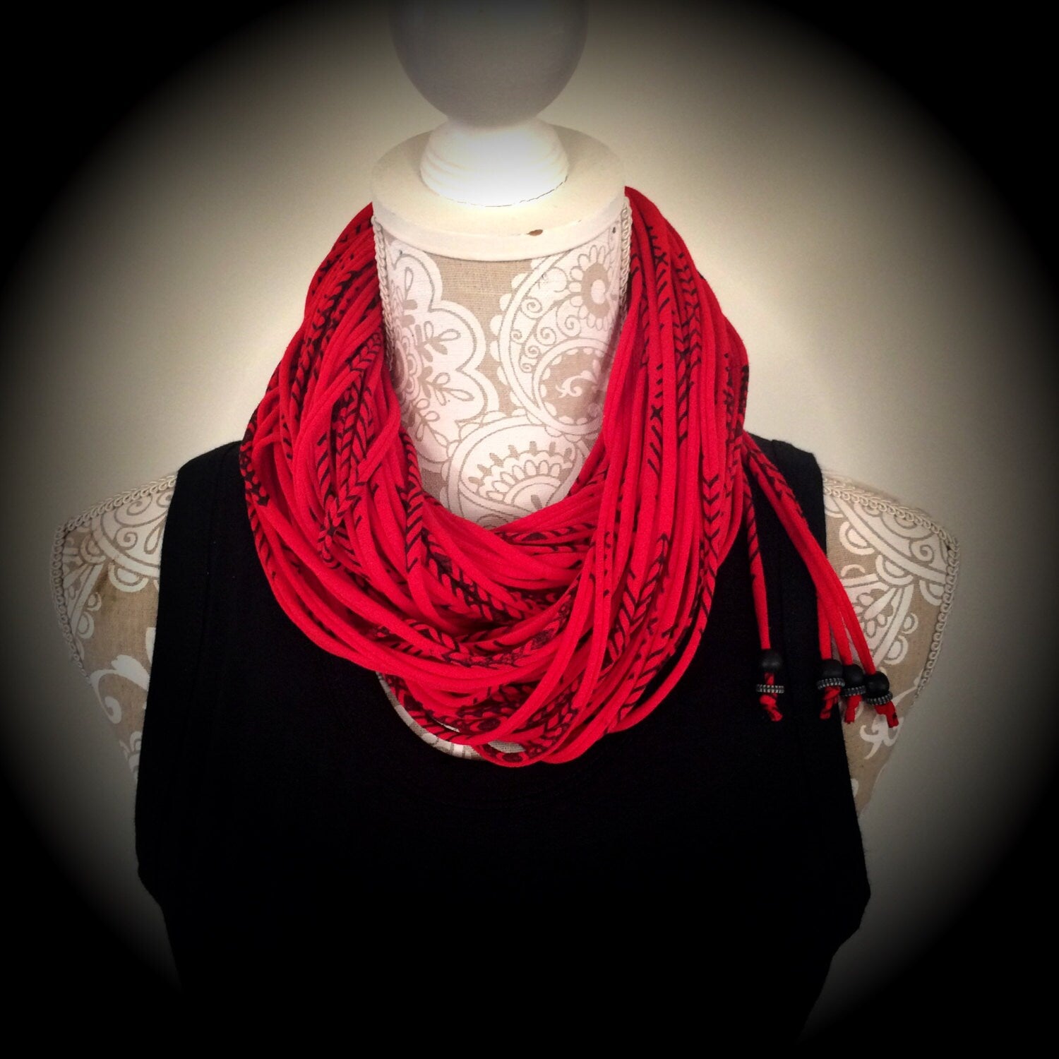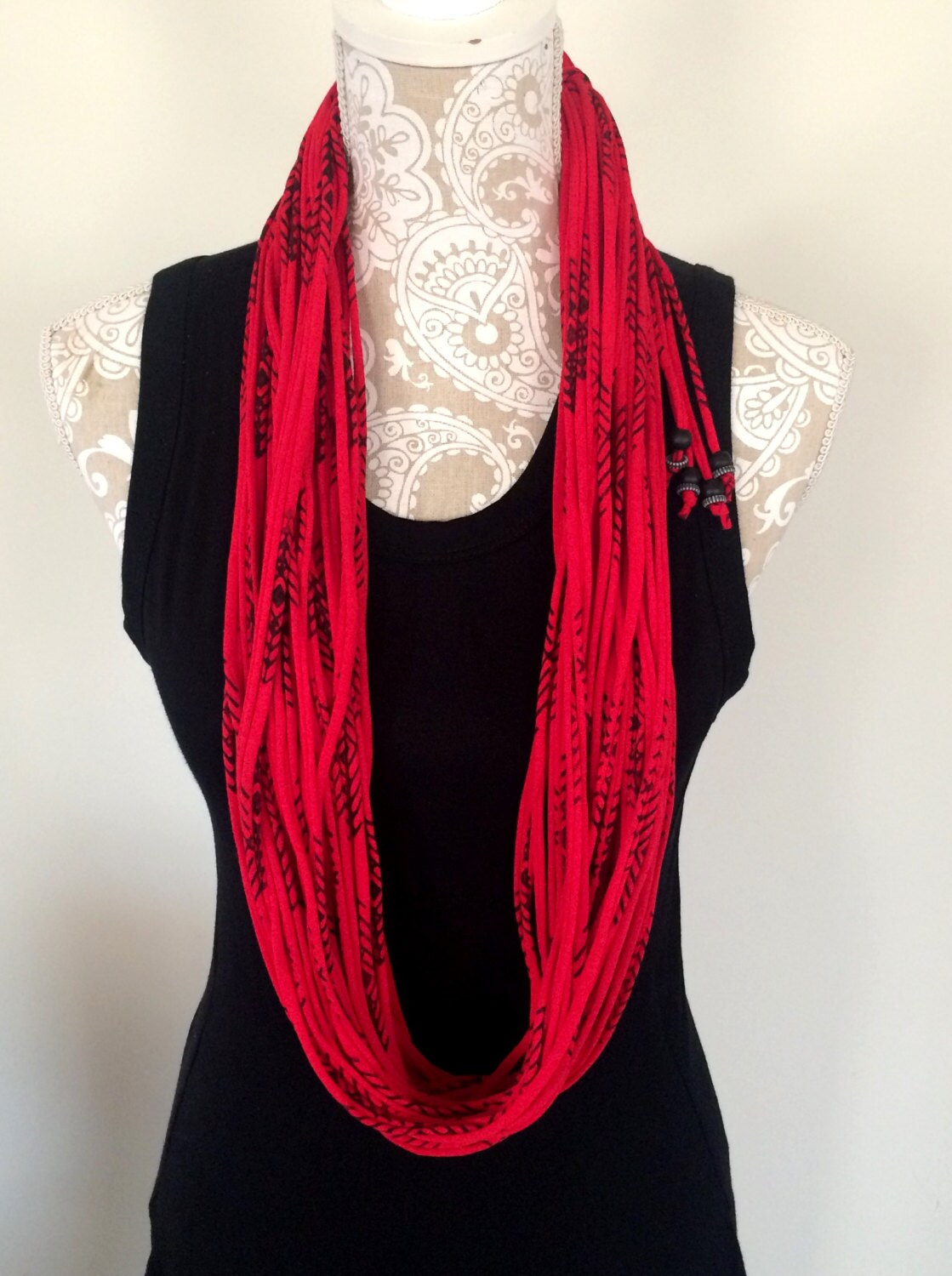 One Scarf. Many Looks. This red-hot multistrand infinity scarf can be worn multiple ways based on individual style and preference. Handprinted with an arrow motif in black non-toxic fabric ink, and handmade with 100% ringspun cotton, this piece is enhanced by simple minimalist bead embellishment. This piece hangs approximately 18 inches from the neckline. Accessorize your most basic t-shirt ensemble with colorful, lightweight neckwear.