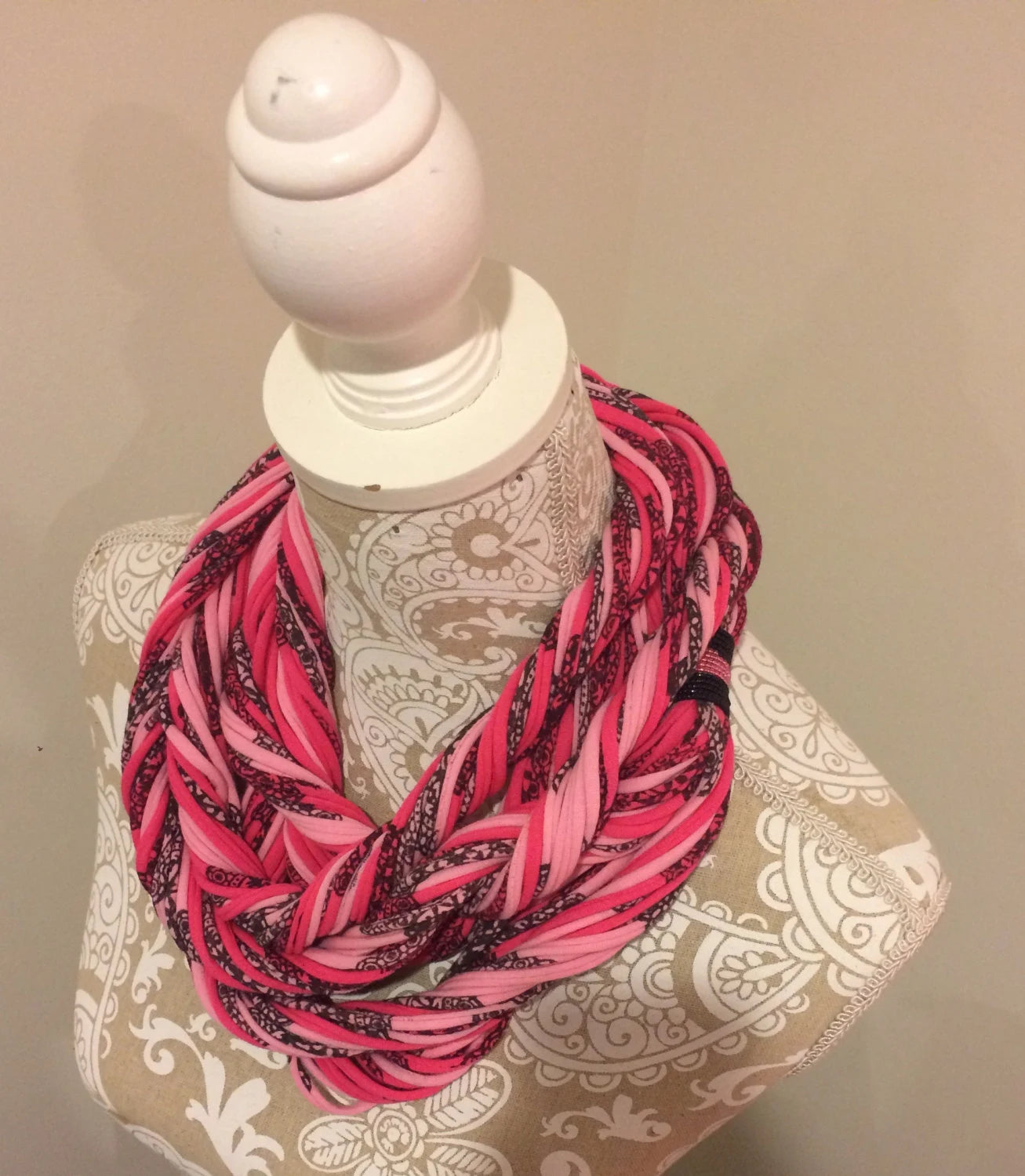 One Scarf. Many Looks. This gradient pink multistrand infinity scarf can be worn multiple ways based on individual style and preference. Handprinted with a lace doily motif in black non-toxic fabric ink, and handmade with 100% ringspun cotton, this piece is enhanced by beautiful hand-strung beaded embellishment. This piece hangs approximately 18 inches from the neckline. Accessorize your most basic t-shirt ensemble with colorful, lightweight neckwear.