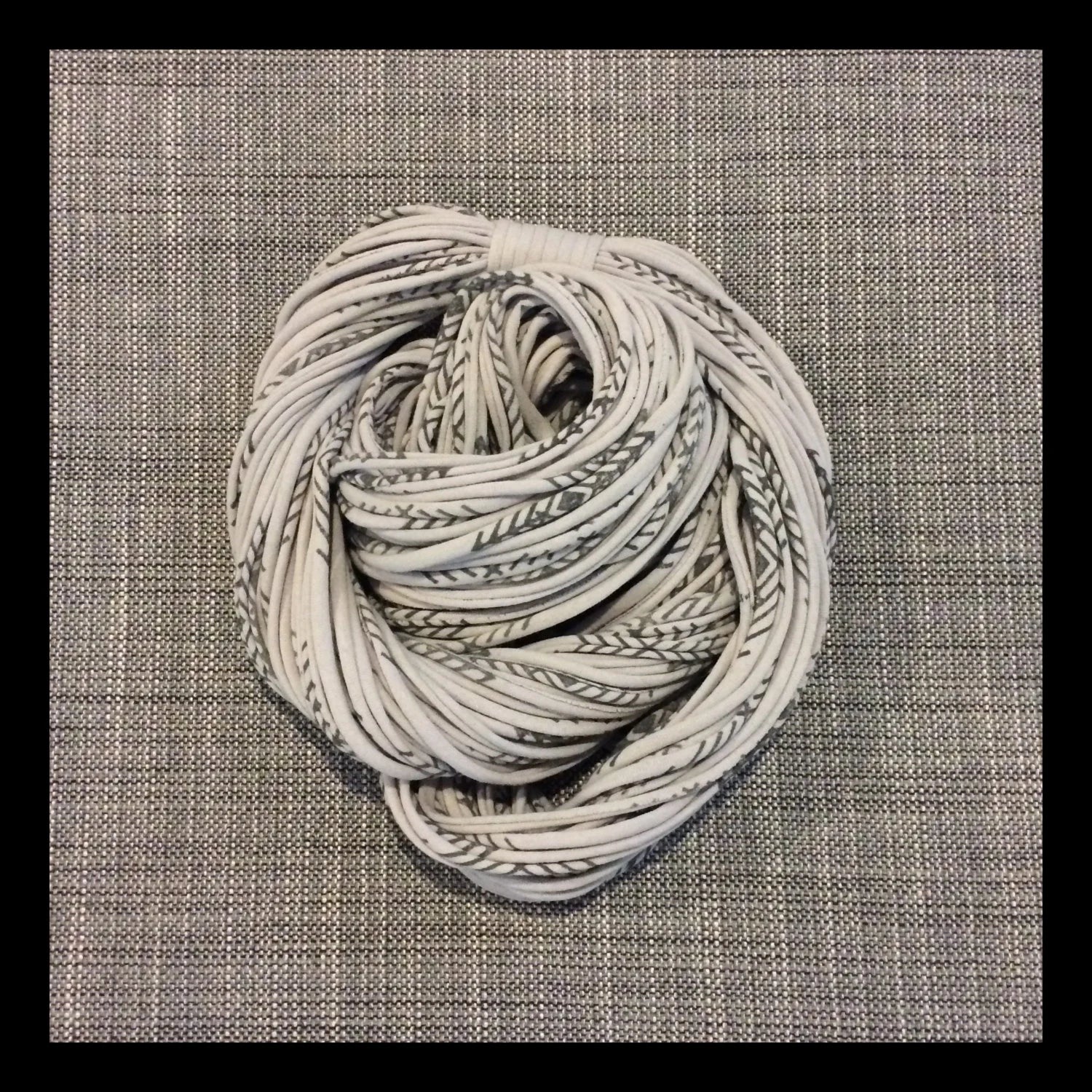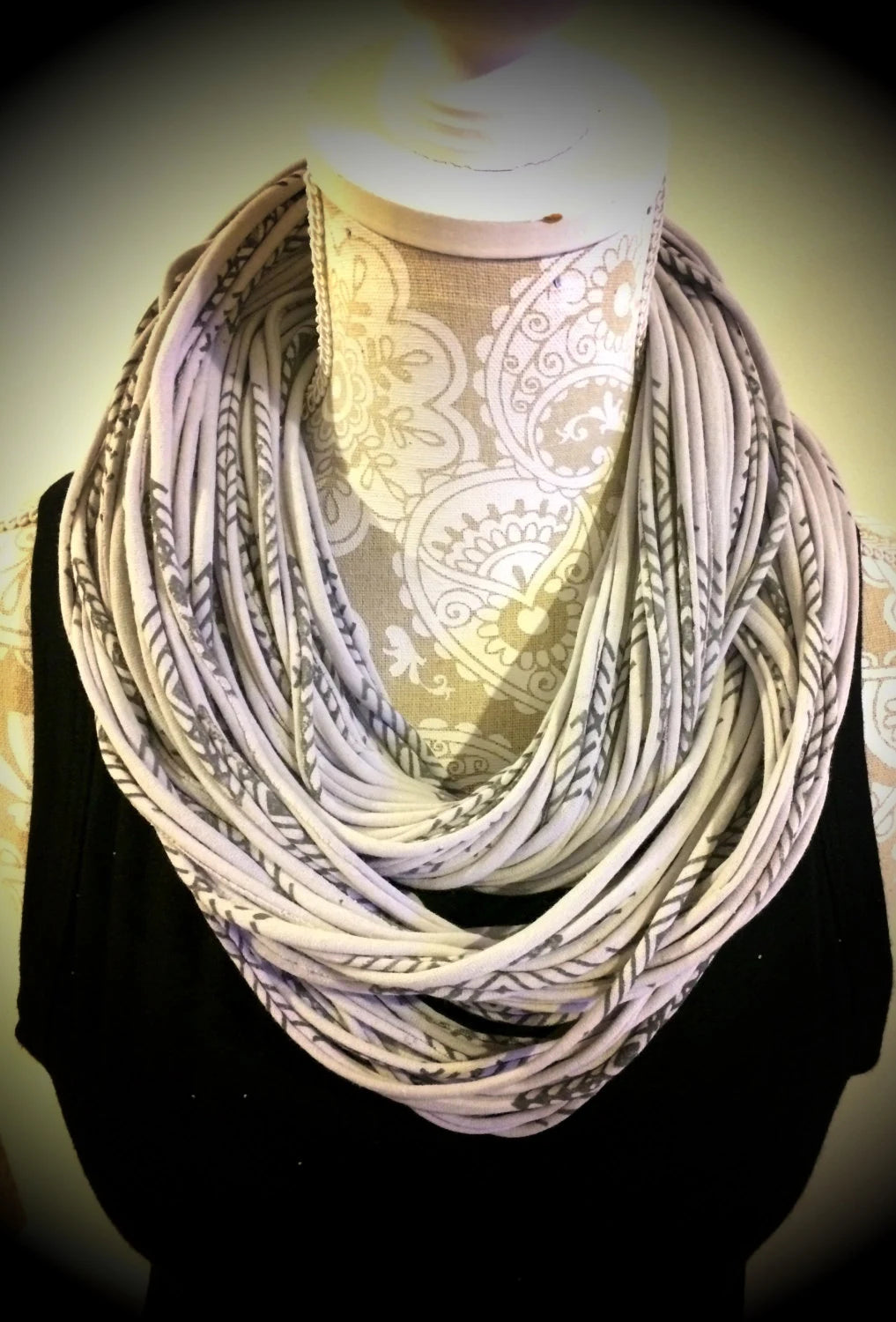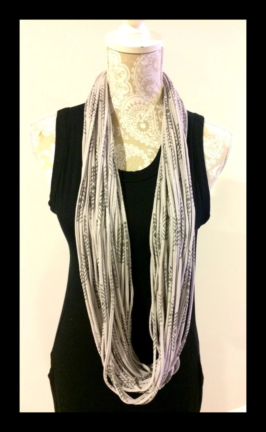 One Scarf. Many Looks. This grey multistrand infinity scarf can be worn multiple ways based on individual style and preference. This piece has a handprinted arrow motif with charcoal grey non-toxic fabric ink, and handmade with soft-feel 100% ringspun cotton. This piece hangs approximately 18 inches from the neckline. Accessorize your most basic t-shirt ensemble with colorful, lightweight neckwear.