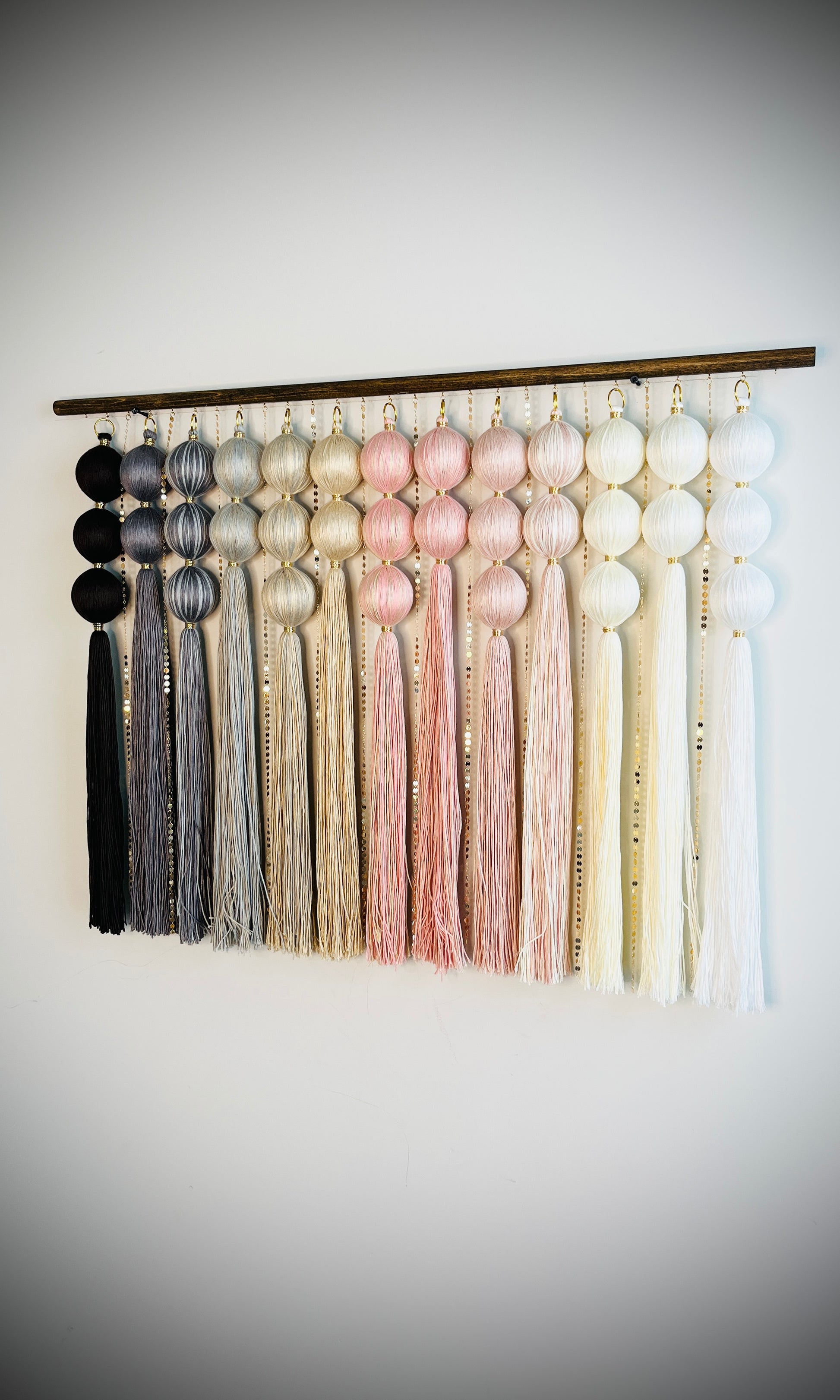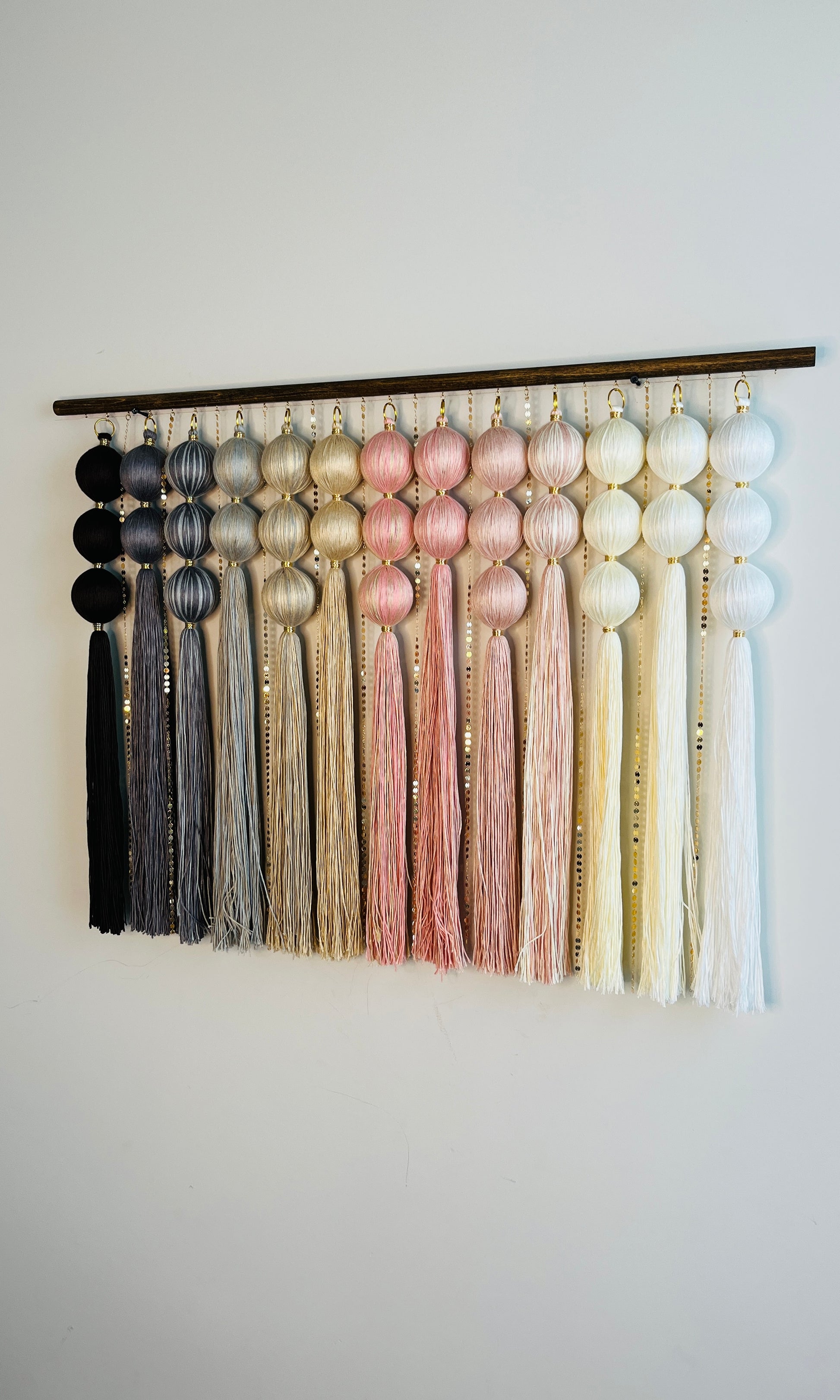 Rose Dune is a fiber art wall sculpture that evokes the serenity of wind-swept desert sands touched by a gentle blush of pink. A cascading gradient flows from deep brown, charcoal and earthy taupe through soft rose, dusty blush, and into luminous ivory and white — all anchored by sculptural spheres in fiber form and shimmering gold-plated sequin chain and wire coil accents. Each strand is hand-strung with care, designed to sway gently with movement, bringing both visual rhythm and subtle acoustic dampening to your space.